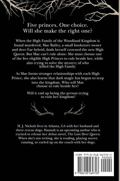 "You're gorgeous. You're funny, witty even. You're not afraid to fight back. You're smart. And that's a dangerous combination." "How's that?" I ask, leaning closer to him. His eyes are locked on my lips. His voice is low as he says, "Any smart male would kill to sit beside you." Five princes. One choice. Will she make the right one? When the High Family of the Woodland Kingdom is found murdered, Mae Bailey, a small bookstore owner and deer-Fae hybrid, finds herself crowned the new High Queen. But Mae can't rule alone. She must choose one of the five eligible High Princes to rule beside her, while also trying to solve the mystery of who killed the High Family. As Mae forms stronger relationships with each High Prince, she also learns that dark magic has begun to seep into the kingdom. Who will Mae choose to rule beside her? And will it end up being the person trying to ruin her kingdom? The Lost Deer Queen is H. J. Nichols' romantasy debut that features a bachelorette-style romance, murder mystery, and tackles complex mental health issues. TLDQ is a tale of love, passion, and betrayal. This novel contains dark elements. Please check the full list of content warnings.