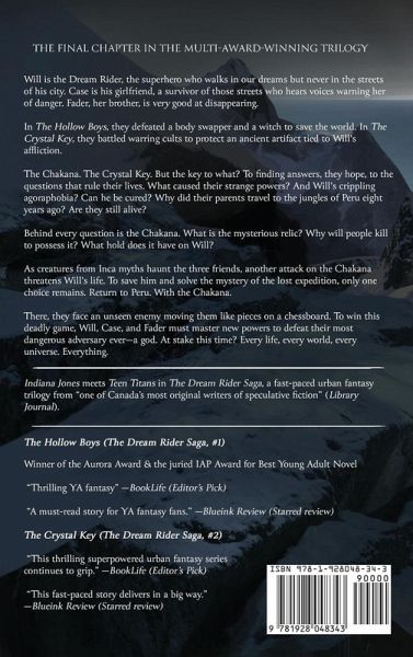 The Thrilling Conclusion to the Multi-Award-Winning Trilogy Will is the Dream Rider, the superhero who walks in our dreams but never in the streets of his own city. Case is his girlfriend, a survivor of those streets who hears voices warning her of danger. Fader, her brother, is very good at disappearing. In The Hollow Boys, they defeated a body swapper and a witch to save the world. In The Crystal Key, they battled warring cults to protect an ancient artifact tied to Will's affliction. The Chakana. The Crystal Key. But the key to what? To finding answers, they hope, to the questions that rule their lives. What caused their strange powers? And Will's crippling agoraphobia? Can he be cured? Why did their parents travel to the jungles of Peru eight years ago? Are they still alive? Behind every question is the Chakana. What is the mysterious relic? Why will people kill to possess it? What hold does it have on Will? As creatures from Inca myths haunt the three friends, another attack on the Chakana threatens Will's life. To save him and solve the mystery of the lost expedition, only one choice remains. Return to Peru. With the Chakana. There, they find friends and foes, both old and new. And behind it all, an unseen enemy moving them like pieces on a chessboard. To win this deadly game, Will, Case, and Fader must master new powers to defeat the most dangerous adversary they've ever faced. A god. At stake this time? Every life, every world, every universe. Everything.~~~ Indiana Jones meets Teen Titans in The Dream Rider Saga, a fast-paced urban fantasy trilogy from "one of Canada's most original writers of speculative fiction" (Library Journal).