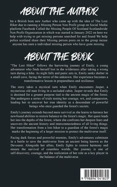 Trapped in the wilderness. Chosen by destiny. Can one woman unlock the secrets that could save-or unravel-the universe? When a solo hiking trip takes a chilling turn, Emily finds herself lost in the forest with no map, no signal, and dwindling supplies. Seeking shelter in a cave as a fierce storm rages overhead, she stumbles into a mystery far greater than her own survival. A strange noise. A hidden cabin. And a man named Jasper, who speaks in riddles and knows far too much about her past. What begins as a fight to stay alive spirals into a journey across mystical landscapes, ancient forests, and otherworldly realms. Emily soon learns she's no ordinary hiker-she's the descendant of the ancient ones, chosen to face trials that will test her courage, wit, and compassion. The fate of not just one forest but the balance of the multiverse rests in her hands. As the guardian of an awakening power, Emily must confront her deepest fears, navigate cosmic battles, and embrace a destiny she never imagined. But will she rise to the challenge before a darkness older than time consumes everything she loves? THE LOST HIKER is a genre-bending adventure blending suspense, fantasy, and metaphysical mystery. For fans of stories where ordinary lives become extraordinary quests, this is a heart-pounding, soul-stirring read that will keep you turning pages long into the night.
