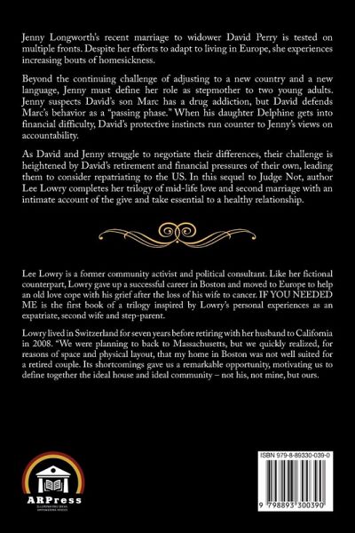 Jenny Longworth's recent marriage to widower David Perry is tested on multiple fronts. Despite her efforts to adapt to living in Europe, she experiences increasing bouts of homesickness.Beyond the continuing challenge of adjusting to a new country and a new language, Jenny must define her role as stepmother to two young adults. Jenny suspects David's son Marc has a drug addiction, but David defends Marc's behavior as a "passing phase." When his daughter Delphine gets into financial difficulty, David's protective instincts run counter to Jenny's views on accountability.As David and Jenny struggle to negotiate their differences, their challenge is heightened by David's retirement and financial pressures of their own, leading them to consider repatriating to the US. In this sequel to Judge Not, author Lee Lowry completes her trilogy of mid-life love and second marriage with an intimate account of the give and take essential to a healthy relationship.
