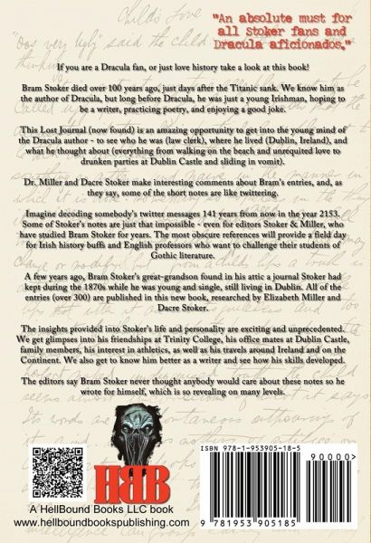 Bram Stoker died over 100 years ago, just days after the Titanic sank. We know him as the author of Dracula, but long before Dracula, he was just a young Irishman, hoping to be a writer, practicing poetry, and enjoying a good joke. This Lost Journal (now found) is an amazing opportunity to get into the young mind of the Dracula author - to see who he was (law clerk), where he lived (Dublin, Ireland), and what he thought about (everything from walking on the beach and unrequited love to drunken parties at Dublin Castle and sliding in vomit). Dr. Miller and Dacre Stoker make interesting comments about Bram's entries, and, as they say, some of the short notes are like twittering. Imagine decoding somebody's twitter messages 141 years from now in the year 2153. Some of Stoker's notes are just that impossible - even for editors Stoker & Miller, who have studied Bram Stoker for years. The most obscure references will provide a field day for Irish history buffs and English professors who want to challenge their students of Gothic literature. A few years ago, Bram Stoker's great-grandson found in his attic a journal Stoker had kept during the 1870s while he was young and single, still living in Dublin. All of the entries (over 300) are published in this new book, researched by Elizabeth Miller and Dacre Stoker. The insights provided into Stoker's life and personality are exciting and unprecedented. We get glimpses into his friendships at Trinity College, his office mates at Dublin Castle, family members, his interest in athletics, as well as his travels around Ireland and on the Continent. We also get to know him better as a writer and see how his skills developed. The editors say Bram Stoker never thought anybody would care about these notes so he wrote for himself, which is so revealing on many levels.