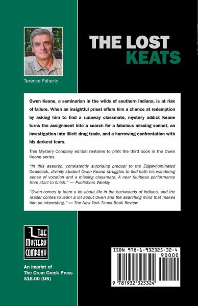Owen Keane, a seminarian in the wilds of southern Indiana, is at risk of failure. When an insightful priest offers him a chance at redemption by asking him to find a runaway classmate, mystery addict Keane turns the assignment into a search for a fabulous missing sonnet, an investigation into illicit drug trade, and a harrowing confrontation with his darkest fears.