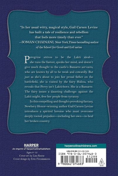 In this compelling and thought-provoking fantasy set in the world of The Two Princesses of Bamarre, Newbery Honor-winning author Gail Carson Levine introduces a spirited heroine who must overcome deeply rooted prejudice?including her own?to heal her broken country. Peregrine strives to live up to the ideal of her people, the Latki?and to impress her parents: affectionate Lord Tove, who despises only the Bamarre, and stern Lady Klausine. Perry runs the fastest, speaks her mind, and doesn't give much thought to the castle's Bamarre servants, whom she knows to be weak and cowardly. But just as she's about to join her father on the front lines, she is visited by the fairy Halina, who reveals that Perry isn't Latki-born. She is Bamarre. The fairy issues a daunting challenge: against the Lakti power, Perry must free her people from tyranny.