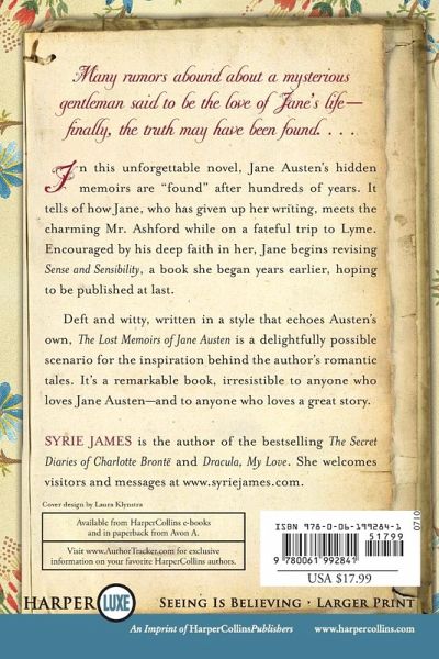 Many rumors abound about a mysterious gentleman said to be the love of Jane's life--finally, the truth may have been found. . . . What if, hidden in an old attic chest, Jane Austen's memoirs were discovered after hundreds of years? What if those pages revealed the untold story of a life-changing love affair? That's the premise behind this spellbinding novel, which delves into the secrets of Jane Austen's life, giving us untold insights into her mind and heart. Jane Austen has given up her writing when, on a fateful trip to Lyme, she meets the well-read and charming Mr. Ashford, a man who is her equal in intellect and temperament. Inspired by the people and places around her, and encouraged by his faith in her, Jane begins revising Sense and Sensibility, a book she began years earlier, hoping to be published at last. Deft and witty, written in a style that echoes Austen's own, this unforgettable novel offers a delightfully possible scenario for the inspiration behind this beloved author's romantic tales. It's a remarkable book, irresistible to anyone who loves Jane Austen--and to anyone who loves a great story.