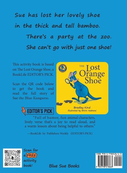 This activity book is based on the book, The Lost Orange Shoe. It includes coloring pages, spot the difference pages, games, crossword puzzles, and word searches. More information: https://booklife.com/project/the-lost-orange-shoe-96257 The main book tells the story of Sue the Blue Kangaroo(TM), who has lost her lovely shoe, in the thick and tall bamboo. There's a party at the zoo. She can't go with just one shoe! Do you see her orange shoe? Say "I found it!" when you do. The Lost Orange Shoe, was selected EDITOR'S PICK by BookLife. The Lost Orange Shoe is a rhyming picture book about Sue the Blue Kangaroo who has just moved to a new zoo and loses a shoe in her move. Sue ends up helping many baby animals and makes a few new friends. After all the help and searching, Sue solves a puzzle that may help her find her shoe.