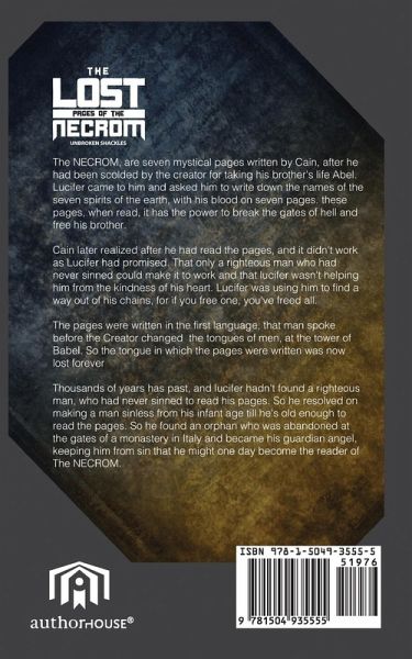 The Necrom consists of seven mystical pages written by Cain after he had been scolded by the Creator for taking his brother's life. Lucifer came to him and asked him to write the down the names of the seven spirits of the earth, with his blood, on seven pages. That if these pages were read by a righteous man who had never sinned, it would break the gates of hell and free his brother. Cain later realized after he had read the pages that it didn't work as Lucifer had promised. That only a righteous man who had never sinned could make it work and that Lucifer wasn't helping him from the kindness of his heart. Lucifer was using him to find a way out of his chains, for if you free one, you've freed all. The pages were written in the first language that man spoke before the Creator changed the tongues of men at the tower of Babel. So the tongue in which the pages were written was now lost forever. Thousands of years have passed, and Lucifer hasn't found a righteous man who had never sinned to read his pages. So he resolved on making a man sinless from his infant age till he's old enough to read the pages. So he found an orphan who was abandoned at the gates of a monastery in Italy and became his guardian angel, keeping him from sin that he might become the reader.