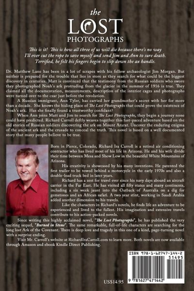 This is it! This is how all three of us will die because there's no way I'll ever cut the rope to save myself and send Jim and Ann to sure death. Terrified, he felt his fingers begin to slip down the ax handle. Dr. Matthew Lane has been in a lot of scrapes with his fellow archaeologist Jim Morgan. But neither is prepared for the trouble that lies in store as they search for what could be the biggest discovery in centuries. Matt is convinced that the testimony from the Russian soldiers who swore they photographed Noah's ark protruding from the glacier in the summer of 1916 is true. They claimed all the documentation, measurements, description of the interior cages and photographs were turned over to the czar just before the revolution. A Russian immigrant, Ann Tyler, has carried her grandmother's secret with her for more than a decade. She knows the hiding place of The Lost Photographs that could prove the existence of Noah's ark. Has she finally found a trustworthy confidant? When Ann joins Matt and Jim to search for The Lost Photographs, they begin a journey none could have predicted. Richard Carroll deftly weaves together this fast-paced adventure based on the old stories of Russian soldiers discovering the ark on Mount Ararat. Uncover the enduring enigma of the ancient ark and the crusade to conceal the truth. This novel is based on a well-documented story that many people believe to be true.