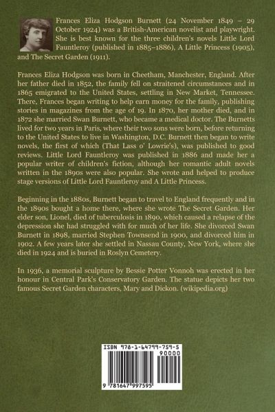 Frances Eliza Hodgson Burnett (24 November 1849 – 29 October 1924) was a British-American novelist and playwright. She is best known for the three children's novels Little Lord Fauntleroy (published in 1885–1886), A Little Princess (1905), and The Secret Garden (1911). Frances Eliza Hodgson was born in Cheetham, Manchester, England. After her father died in 1852, the family fell on straitened circumstances and in 1865 emigrated to the United States, settling in New Market, Tennessee. There, Frances began writing to help earn money for the family, publishing stories in magazines from the age of 19. In 1870, her mother died, and in 1872 she married Swan Burnett, who became a medical doctor. The Burnetts lived for two years in Paris, where their two sons were born, before returning to the United States to live in Washington, D.C. Burnett then began to write novels, the first of which (That Lass o' Lowrie's), was published to good reviews. Little Lord Fauntleroy was published in 1886 and made her a popular writer of children's fiction, although her romantic adult novels written in the 1890s were also popular. She wrote and helped to produce stage versions of Little Lord Fauntleroy and A Little Princess. Beginning in the 1880s, Burnett began to travel to England frequently and in the 1890s bought a home there, where she wrote The Secret Garden. Her elder son, Lionel, died of tuberculosis in 1890, which caused a relapse of the depression she had struggled with for much of her life. She divorced Swan Burnett in 1898, married Stephen Townsend in 1900, and divorced him in 1902. A few years later she settled in Nassau County, New York, where she died in 1924 and is buried in Roslyn Cemetery. In 1936, a memorial sculpture by Bessie Potter Vonnoh was erected in her honour in Central Park's Conservatory Garden. The statue depicts her two famous Secret Garden characters, Mary and Dickon. (wikipedia.org)