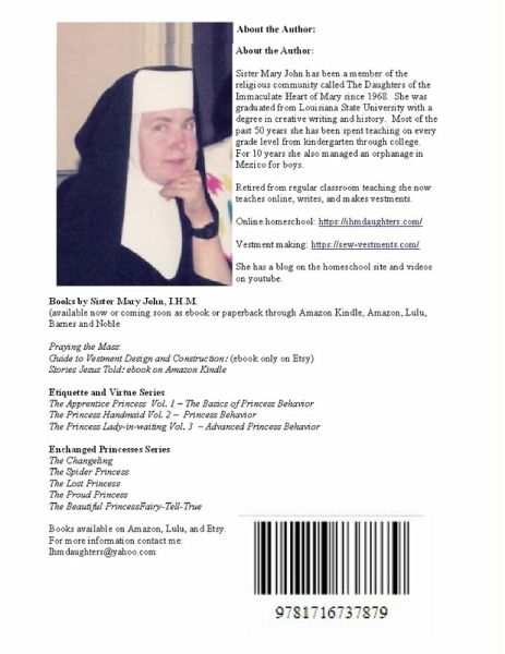 The author: Sister Mary John, has been a member of the religious community called The Daughters of the Immaculate Heart of Mary since 1968. She was graduated from Louisiana State University with a degree in creative writing and history. Most of the past 50 years she has been spent teaching on every grade level from kindergarten through college. For 10 years she also managed an orphanage in Mexico for boys. Retired from regular classroom teaching she now teaches online, writes, and makes vestments. She authored the "Guide to Vestment Design and Construction" more than twenty years ago and remains a sought after book. Since retirement she has expanded into other genre including etiquette, fantasy, and religious. Online homeschool: https://ihmdaughters.com/ Vestment making: https://sew-vestments.com/ She has a blog on the homeschool site and free vestment making videos on youtube. Her books include: Books by Sister Mary John, I.H.M. (available now or coming soon - IHMCharityShop.com, Amazon Kindle (ebook), Amazon, Lulu, or Barnes and Noble Praying the Mass: Guide to Vestment Design and Construction: (only available on Etsy) Stories Jesus Told: Etiquette and Virtue Series The Apprentice Princess Vol. 1 - The Basics of Princess Behavior ages 6 - 9 The Princess Handmaid Vol. 2 - Princess Behavior ages 10 --13 The Princess Lady-in-waiting Vol. 3 - Advanced Princess Behavior ages 14 and up Enchanged Princess Series The Changeling - Vol 1 The Spider Princess - Vol 2 The Lost Princess - Vol 3 The Proud Princess - Vol 4 The Beautiful Princess - Vol 5 About the Illustrator: Sergey Avdeev is a famous Siberian artist and teaches at The Tomsk State University. He is a member of the following recognized Art Associations: Union of Artists of Russia, Member of International Association of Art, International Association of Plastic Arts - IAA AIAP UNESCO. Sergey is noted for his children's book illustrations which he draws in different techniques and genres. He is highly skilled in the following techniques: lithography, hand drawing: ink, charcoal, pencil, pastel, watercolor, oil painting, acrylic, as well as digital illustration. Although he enjoys illustrating children's books he does not limit himself to that art form, but contributes to art in many other fields as well. You can learn more about Sergey's work on the website https://avdeev-art.com
