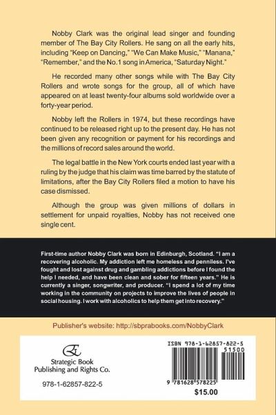Nobby Clark was the original lead singer and founding member of The Bay City Rollers. He sang on all the early hits, including "Keep on Dancing," "We Can Make Music," "Manana," "Remember," and the No.1 song in America, "Saturday Night." He recorded many other songs while with The Bay City Rollers and wrote songs for the group, all of which have appeared on at least twenty-four albums sold worldwide over a forty-year period. Nobby left the Rollers in 1974, but these recordings have continued to be released right up to the present day. He has not been given any recognition or payment for his recordings and the millions of record sales around the world. The legal battle in the New York courts ended last year with a ruling by the judge that his claim was time barred by the statute of limitations, after the Bay City Rollers filed a motion to have his case dismissed. Although the group was given millions of dollars in settlement for unpaid royalties, Nobby has not received one single cent. First-time author Nobby Clark was born in Edinburgh, Scotland. "I am a recovering alcoholic. My addiction left me homeless and penniless. I've fought and lost against drug and gambling addictions before I found the help I needed, and have been clean and sober for fifteen years." He is currently a singer, songwriter, and producer. "I spend a lot of my time working in the community on projects to improve the lives of people in social housing. I work with alcoholics to help them get into recovery." Publisher's website: http://sbprabooks.com/NobbyClark