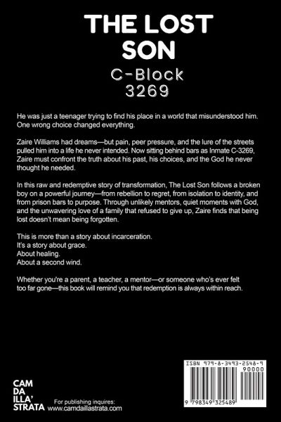 He was just a teenager trying to find his place in a world that misunderstood him. One wrong choice changed everything. Zaire Williams had dreams-but pain, peer pressure, and the lure of the streets pulled him into a life he never intended. Now sitting behind bars as Inmate C-3269, Zaire must confront the truth about his past, his choices, and the God he never thought he needed. In this raw and redemptive story of transformation, The Lost Son follows a broken boy on a powerful journey-from rebellion to regret, from isolation to identity, and from prison bars to purpose. Through unlikely mentors, quiet moments with God, and the unwavering love of a family that refused to give up, Zaire finds that being lost doesn't mean being forgotten. This is more than a story about incarceration. It's a story about grace. About healing. About a second wind. Whether you're a parent, a teacher, a mentor-or someone who's ever felt too far gone-this book will remind you that redemption is always within reach