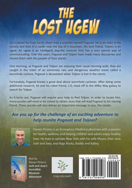In a galaxy far from our own home in the milky Way, there orbits a planet quite similar to Earth. It is a blue and green world that is home to dense rain forests, vast grasslands, deep blue oceans and majestic mountains. On this planet, there lives a scientist named Pogavat. He is an elder in his society and lives in a castle near the top of a mountain. His best friend, Toljeer, is an ugew. An ugew is an intelligent dog-like creature that has a very special way of communicating. Over the years, Pogavat and Toljeer have made many discoveries and shared them with the people of their planet. One morning, as Pogavat and Toljeer are enjoying their usual morning walk, they are caught in the midst of an extremely rare and dangerous weather event called a wormhole cyclone. Pogavat is devastated when Toljeer is lost in the storm. Fortunately, Pogavat knows a great deal about wormhole cyclones. After doing some additional research, he and his robot friend, J-O, head off to the Milky Way galaxy to search for Toljeer. As it turns out, Pogavat will require your help to find Toljeer. In order to locate him, many puzzles will need to be solved to obtain clues that will lead Pogavat to his missing friend. These puzzles will also deliver an important message to you, the reader. Are you up for the challenge of an exciting adventure to help reunite Pogavat and Toljeer?