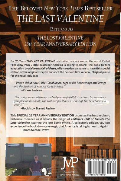 The "Special 25th Anniversary Edition" of THE LOST VALENTINE (2024) takes the reader back in time to the days of World War Two as Caroline Thomas waits faithfully through the next 50 years for her husband, Navy Pilot, Lieutenant Neil Thomas to keep a date and a promise. Her wait begins at Union Train Station, Los Angeles. As told by her son, Neil Thomas, Jr. to reporter and journalist Susan Allison, a promise to return by their wedding anniversary, Valentine's Day 1945, doesn't stop Caroline from keeping her promise to her MIA husband. The timeless love story, viewed by millions of Hallmark Hall of Fame movie fans, shares Caroline's views about the nature of true and enduring love. Can Susan Allison learn Caroline's romantic secret, as Neil Jr shares the mysterious and startling nature of a promise finally kept? And when she does, can second chances and love become as real for them as Caroline and her husband's love once was? The original work was titled, The Last Valentine, and was adapted to film by Hallmark Hall of Fame in 2011 as The Lost Valentine, starring Betty White and Jennifer Love Hewitt. Readers a young as 11 years old and as old as 100, have shared with the author their love for the story and its impact personally upon them. "Mr. Pratt: I first wrote to you about my love for The Last Valentine when I was just 11. I just graduated from Boston College and thought you'd like to know it continues to impact my life." ~Grace Huang "It is now midnight, the witching hour, and I just finished reading The Last Valentine for the 6th time! Yes, I cried my eyes out again, at the most beautiful love story I have ever read! Everyone from 16 years old and up should read this story!" ~Helen Mulholland "I gave an oral review of The Lost Valentine just the other day at our book club and there wasn't a dry eye in the room by the time I finished. You sure do have a way of telling a love story! Don't change!" ~Georgina Tacconi The author now owns all publishing rights and is taking the time to edit and enhance this special edition as well as other works formerly published by major industry names. More information and background on this, and coming titles for republishing, may be found at the author's website: www.jamesmichaelpratt.com.