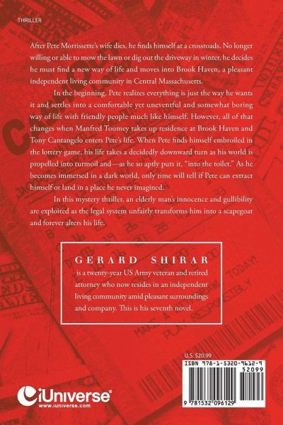 Pete Morrissette's wife Cath has passed on and Pete finds himself at a crossroads. No longer willing or able to mow the lawn or dig out the driveway in winter he decides he must find a new way of life and settles on the assisted living community of Brook Haven in Central Massachusetts where life is pleasant and the amenities comfortable. In the beginning he finds things just the way he wants them and he settles into a pleasant but uneventful and somewhat boring way of life with friendly people much like himself, with the pressures and expectations of their younger years behind them. However all that changes when Manfred Toomey takes up residence at Brook Haven and Tony Cantangelo enters Pete's life. Things take a decidedly downward turn for Pete as he finds himself caught up in the Lottery game, something that will drastically change his life and send his world into topsy-turvy turmoil and... as he so apply puts it... "into the toilet." In this mystery thriller an elderly man's innocence and gullibility are exploited and the legal system unfairly makes him a scape goat, forever altering a decent elderly man's life.