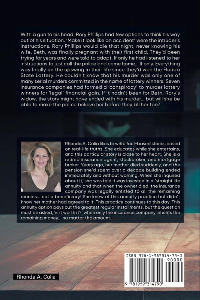 With a gun to his head, Rory Phillips had few options to think his way out of his situation. 'Make it look like an accident' were the intruder's instructions. Rory Phillips would die that night, never knowing his wife, Beth, was finally pregnant with their first child. They'd been trying for years and were told to adopt. If only he had listened to her instructions to just call the police and come home... If only. Everything was finally on the upswing in their life since they'd won the Florida State Lottery. He couldn't know that his murder was only one of many serial murders committed in the name of lottery winners. Seven insurance companies had formed a 'conspiracy' to murder lottery winners for 'legal' financial gain. If it hadn't been for Beth, Rory's widow, the story might have ended with his murder... but will she be able to make the police believe her before they kill her too? Rhonda A. Colia likes to write fact-based stories based on real-life truths. She educates while she entertains, and this particular story is close to her heart. She is a retired insurance agent, stockbroker, and mortgage broker. Years ago, her mother died suddenly, and the pension she'd spent over a decade building ended immediately and without warning. When she inquired about it, she was told it was invested in a 'straight life annuity and that when the owner died, the insurance company was legally entitled to all the remaining monies... not a beneficiary! She knew of this annuity practice but didn't know her mother had agreed to it. This practice continues to this day. This annuity option pays out the greatest regular installments, but the question must be asked, 'is it worth it?' when only the insurance company inherits the remaining money... no matter the amount.
