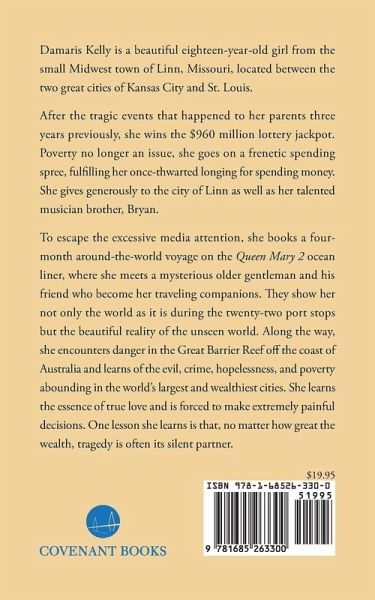 Damaris Kelly is a beautiful eighteen-year-old girl from the small Midwest town of Linn, Missouri, located between the two great cities of Kansas City and St. Louis.After the tragic events that happened to her parents three years previously, she wins the $960 million lottery jackpot. Poverty no longer an issue, she goes on a frenetic spending spree, fulfilling her once-thwarted longing for spending money. She gives generously to the city of Linn as well as her talented musician brother, Bryan.To escape the excessive media attention, she books a four-month around-the-world voyage on the Queen Mary 2 ocean liner, where she meets a mysterious older gentleman and his friend who become her traveling companions. They show her not only the world as it is during the twenty-two port stops but the beautiful reality of the unseen world. Along the way, she encounters danger in the Great Barrier Reef off the coast of Australia and learns of the evil, crime, hopelessness, and poverty abounding in the world's largest and wealthiest cities. She learns the essence of true love and is forced to make extremely painful decisions. One lesson she learns is that, no matter how great the wealth, tragedy is often its silent partner.