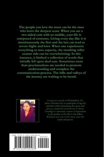 The people you love the most can be the ones who leave the deepest scars. When you are a two-sided coin with no middle, your life is composed of extremes. Living every day like it is simultaneously the first and the last can lead to severe highs and lows. When one experiences everything at max capacity, the resulting roller coaster ride can be overwhelming. In this instance, it birthed a collection of words that initially fell upon deaf ears. Sometimes more than proclamations are needed to promote understanding and complete the communication process. The hills and valleys of the journey are waiting to be heard.
