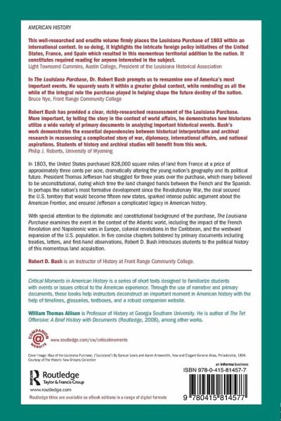 In 1803, the United States purchased 828,000 square miles of land from France at a price of approximately three cents per acre, dramatically altering the young nation's geography and its political future. President Thomas Jefferson had struggled for three years over the purchase, which many believed to be unconstitutional, during which time the land changed hands between the French and the Spanish. In perhaps the nation's most formative development since the Revolutionary War, the deal secured the U.S. territory that would become fifteen new states, sparked intense public argument about the American Frontier, and ensured Jefferson a complicated legacy in American history. With special attention to the diplomatic and constitutional background of the purchase, The Louisiana Purchase examines the event in the context of the Atlantic world, including the impact of the French Revolution and Napoleonic wars in Europe, colonial revolutions in the Caribbean, and the westward expansion of the U.S. population. In five concise chapters bolstered by primary documents including treaties, letters, and first-hand observations, Robert D. Bush introduces students to the political history of this momentous land acquisition.