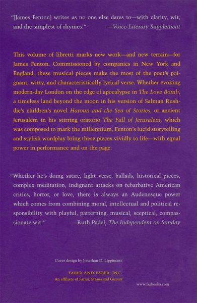 Three Libretti-Ranging In Setting From Ancient Jerusalem To Pre-Apocalyptic London-From An Acclaimed Poet This volume of libretti marks new work-and new terrain-for James Fenton. Commissioned by companies in New York and England, these musical pieces make the most of the poet's poignant, witty, and characteristically lyrical verse. Whether evoking modern-day London on the edge of apocalypse in The Love Bomb, a timeless land beyond the moon in this version of Salman Rushdie's children's novel Haroun and the Sea of Stories, or ancient Jerusalem in his stirring oratorio The Fall of Jerusalem, which was composed to mark the millennium, Fenton's lucid storytelling and stylish wordplay bring these pieces vividly to life-with equal power in performance or on the page. Haroun and the Sea of Stories was commissioned by the New York City Opera and had its premiere at Lincoln Center in September 2003. "[James Fenton] writes as no one else dares to--with clarity, wit, and the simplest of rhymes."--Voice Literary Supplement
