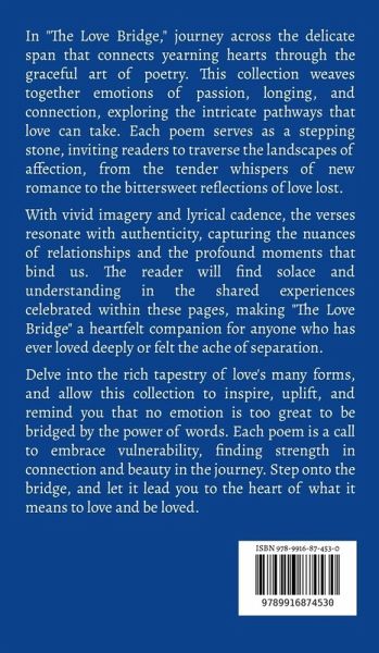 In "The Love Bridge," journey across the delicate span that connects yearning hearts through the graceful art of poetry. This collection weaves together emotions of passion, longing, and connection, exploring the intricate pathways that love can take. Each poem serves as a stepping stone, inviting readers to traverse the landscapes of affection, from the tender whispers of new romance to the bittersweet reflections of love lost. With vivid imagery and lyrical cadence, the verses resonate with authenticity, capturing the nuances of relationships and the profound moments that bind us. The reader will find solace and understanding in the shared experiences celebrated within these pages, making "The Love Bridge" a heartfelt companion for anyone who has ever loved deeply or felt the ache of separation. Delve into the rich tapestry of love's many forms, and allow this collection to inspire, uplift, and remind you that no emotion is too great to be bridged by the power of words. Each poem is a call to embrace vulnerability, finding strength in connection and beauty in the journey. Step onto the bridge, and let it lead you to the heart of what it means to love and be loved.