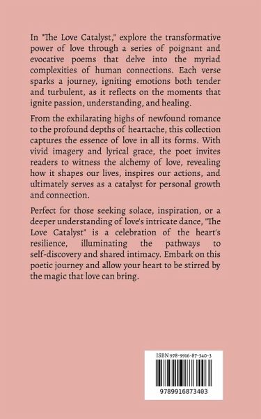 In "The Love Catalyst," explore the transformative power of love through a series of poignant and evocative poems that delve into the myriad complexities of human connections. Each verse sparks a journey, igniting emotions both tender and turbulent, as it reflects on the moments that ignite passion, understanding, and healing. From the exhilarating highs of newfound romance to the profound depths of heartache, this collection captures the essence of love in all its forms. With vivid imagery and lyrical grace, the poet invites readers to witness the alchemy of love, revealing how it shapes our lives, inspires our actions, and ultimately serves as a catalyst for personal growth and connection. Perfect for those seeking solace, inspiration, or a deeper understanding of love's intricate dance, "The Love Catalyst" is a celebration of the heart's resilience, illuminating the pathways to self-discovery and shared intimacy. Embark on this poetic journey and allow your heart to be stirred by the magic that love can bring.