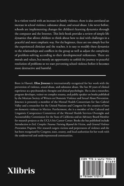 In a violent world with an increase of family violence there is also correlated an increase of school violence, substance abuse and sexual abuse. Like never before the schools are implementing changes for the children's learning dynamics through the computer and the internet. This little book provides a review of simple live dynamics that allow for children to think how to deal with challenges in a peaceful and more emphatic way, for the beginner there are too simple but for the experienced clinician and the teacher it is easy to modify this dynamics to the relationships and conflicts in the group as well as adjust the complexity of problem solving according to their developmental milestones. There are morals and values, but mostly an opportunity to unfold the journey to peaceful resolution of problems so we start preventing school violence before it becomes more destructive and harmful.