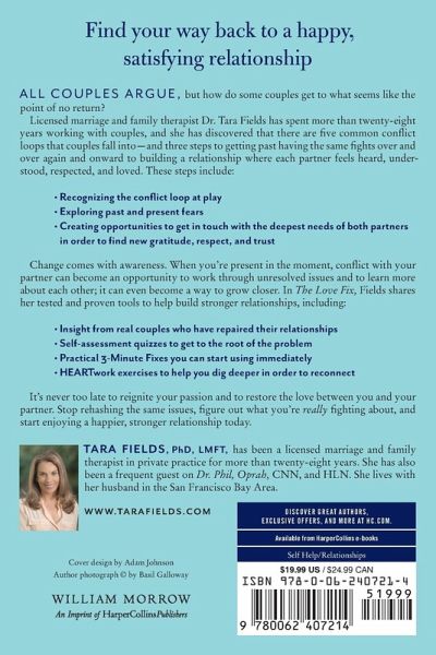 Find your way back to a happy, satisfying relationship All couples argue, but how do some couples get to what seems like the point of no return? Licensed marriage and family therapist Dr. Tara Fields has spent more than twenty-eight years working with couples, and she has discovered that there are five common conflict loops that couples fall into?and three steps to getting past having the same fights over and over again and onward to building a relationship where each partner feels heard, understood, respected, and loved. These steps include: * Recognizing the conflict loop at play * Exploring past and present fears * Creating opportunities to get in touch with the deepest needs of both partners in order to find new gratitude, respect, and trust Change comes with awareness. When you're present in the moment, conflict with your partner can become an opportunity to work through unresolved issues and to learn more about each other; it can even become a way to grow closer. In The Love Fix, Fields shares her tested and proven tools to help build stronger relationships, including: * Insight from real couples who have repaired their relationships * Self-assessment quizzes to get to the root of the problem * Practical 3-Minute Fixes you can start using immediately * HEARTwork exercises to help you dig deeper in order to reconnect It's never too late to reignite your passion and to restore the love between you and your partner. Stop rehashing the same issues, figure out what you're really fighting about, and start enjoying a happier, stronger relationship today.