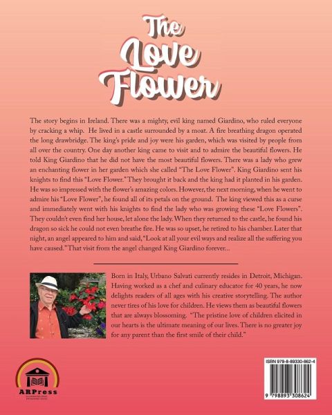 The story begins in Ireland. There was a mighty, evil king named Giardino, who ruled everyone by cracking a whip. He lived in a castle surrounded by a moat. A fire breathing dragon operated the long drawbridge. The king's pride and joy were his garden, which was visited by people from all over the country. One day another king came to visit and to admire the beautiful flowers. He told King Giardino that he did not have the most beautiful flowers. There was a lady who grew an enchanting flower in her garden which she called "The Love Flower". King Giardino sent his knights to find this "Love Flower." They brought it back and the king had it planted in his garden. He was so impressed with the flower's amazing colors. However, the next morning, when he went to admire his "Love Flower", he found all of its petals on the ground. The king viewed this as a curse and immediately went with his knights to find the lady who was growing these "Love Flowers". They couldn't even find her house, let alone the lady. When they returned to the castle, he found his dragon so sick he could not even breathe fire. He was so upset, he retired to his chamber. Later that night, an angel appeared to him and said, "Look at all your evil ways and realize all the suffering you have caused." That visit from the angel changed King Giardino forever...