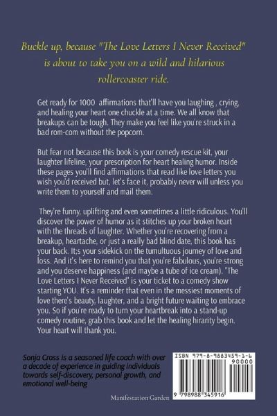 Meet Sonja Cross, a seasoned life coach with over a decade of experience in guiding individuals towards self-discovery, personal growth, and emotional well-being. Sonja has channeled her expertise, empathy, and unique sense of humor into her latest literary creation, "The Love Letters I Never Received."With a passion for illuminating the brighter side of life, Sonja weaves a tapestry of humor, inspiration, and heartfelt wisdom in her book. As a firm believer in the transformative power of affirmations, she uses her extensive knowledge to help readers unlock their true potential and navigate life's ups and downs with grace."The Love Letters I Never Received" is a delightful and thought-provoking journey through the often untrodden paths of self-love and self-acceptance. Sonja draws from her rich reservoir of insights as a life coach to offer readers a fresh perspective on affirmations, encouraging them to laugh at life's quirks and to see the beauty in every moment.Through her writings, Sonja Cross offers a hand to hold and a smile to share, guiding readers toward a more joyful and meaningful life. This book is a testament to her unwavering commitment to uplifting others, reminding us all that even in the most challenging of times, a dose of humor and a dash of self-love can make all the difference.With "The Love Letters I Never Received," Sonja Cross is on a mission to help readers embrace their unique journeys, write their own love letters to themselves, and find inspiration in the everyday moments that make life truly extraordinary.In addition to being an accomplished life coach, Sonja Cross is a sought-after speaker, workshop leader, and mentor. Her work has touched the lives of countless individuals, bringing about positive transformations and encouraging them to live their most authentic, joyful, and inspired lives.For a dose of laughter, inspiration, and a heartfelt reminder of the love that exists within each of us, explore "The Love Letters I Never Received" by Sonja Cross and embark on a delightful journey of self-discovery and affirmation.