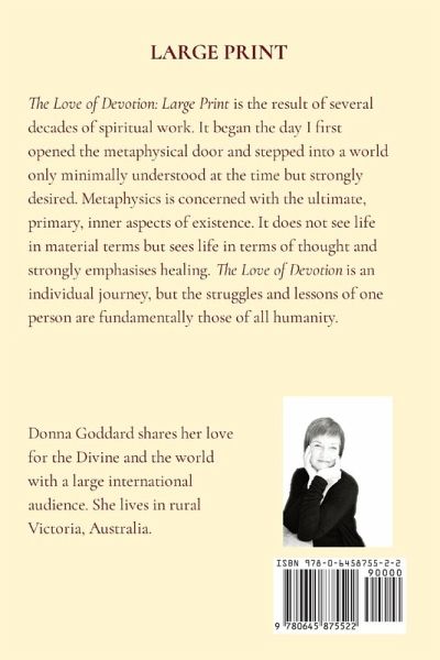This is the LARGE PRINT of The Love of Devotion. Devotion is not a reaching, but a return. In The Love of Devotion, Donna Goddard takes us beyond seeking and into surrender-into the stillness that heals, the love that asks nothing, and the beauty that quietly underlies all things. This is a book for those who are drawn to the subtle light of the sacred. It is for those who long not to possess God, but to dissolve into God. With lyrical insight and deep spiritual presence, the book invites us into communion with the soul-where healing, clarity, and joy arise not from effort, but from letting go. A companion for mystics, healers, and anyone longing to live from the inner sanctuary of truth.