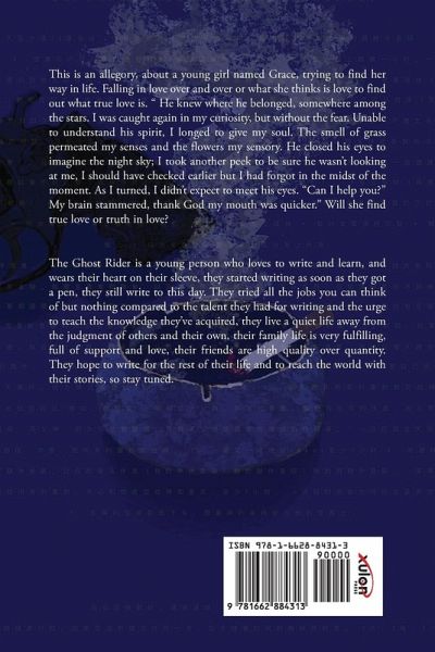 This is an allegory, about a young girl named Grace, trying to find her way in life. Falling in love over and over or what she thinks is love to find out what true love is. " He knew where he belonged, somewhere among the stars. I was caught again in my curiosity, but without the fear. Unable to understand his spirit, I longed to give my soul. The smell of grass permeated my senses and the flowers my sensory. He closed his eyes to imagine the night sky; I took another peek to be sure he wasn't looking at me, I should have checked earlier but I had forgot in the midst of the moment. As I turned, I didn't expect to meet his eyes. "Can I help you?" My brain stammered, thank God my mouth was quicker." Will she find true love or truth in love? The Ghost Rider is a young person who loves to write and learn, and wears their heart on their sleeve, they started writing as soon as they got a pen, they still write to this day. They tried all the jobs you can think of but nothing compared to the talent they had for writing and the urge to teach the knowledge they've acquired, they live a quiet life away from the judgment of others and their own, their family life is very fulfilling, full of support and love, their friends are high quality over quantity. They hope to write for the rest of their life and to reach the world with their story's, so stay tuned.