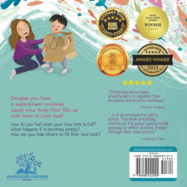 AWARDS AND ACCOLADES: - 2024 Nautilus Award for Small Press Children's Picture Books (silver) - 2024 Book Excellence Awards: Children's Inspirational/Motivational - 2023 Best Book Awards, American Book Fest: Children's Mind/Body/Spirit Award - Literary Titan Gold Book Award - 2023 BREW Children's Book Excellence Award: "Book of The Year," and "Illustrated" categories. - 2023 Firebird Book Awards How can we give our children an understanding of the value of love, kindness, empathy, and compassion? It's challenging to explain the importance of giving and receiving love. Why do some people behave hurtfully? How can we respond with kindness and compassion? The Love Tank guides children in imagining a superpower container inside their bodies that fills up with love. The book explains what can happen when someone's love tank is full--or empty, and how we can help others to fill their love tank.