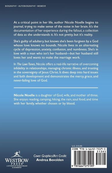 At a critical point in her life, author Nicole Noelle begins to journal, trying to make sense of the noise in her brain. It's the documentation of her experience during the fallout, a collection of data as she understands it. It's not pretty, but it's reality. She's guilty of adultery, but knows she's been forgiven by a God whose love knows no bounds. Nicole lives in an alternating cycle of depression, anxiety, confusion, and numbness. She's in love with a man who isn't her husband-but her husband still loves her and wants to make the marriage work. In The Love Tones, Nicole offers a real-life narrative of overcoming infidelity in relationships, managing chronic illness, and trusting in the sovereignty of Jesus Christ. It dives deep into hard issues and faith development and demonstrates the mercy, grace, and never-failing love of God.