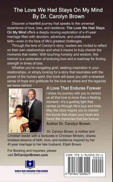 The Love We Had Stays on My Mind By Dr. Carolyn Brown How do you build a love that stands the test of time? What does it mean to cherish someone through life's joys, trials, and unexpected challenges? In The Love We Had Stays on My Mind, Dr. Carolyn Brown shares an extraordinary journey of faith, resilience, and enduring love as she reflects on her 41-year marriage to her late husband, Elijah. From their serendipitous first meeting to the foundation they built together, Carolyn offers readers a rare glimpse into a love story that weathered life's greatest storms while blossoming in faith and devotion. At the heart of this memoir is the profound challenge they faced when Elijah was diagnosed with a rare and aggressive bone cancer in 2002. With raw honesty and heartfelt emotion, Carolyn recounts the strength, courage, and grace they both displayed during Elijah's battle, revealing how their bond deepened even amidst uncertainty and grief. This book is more than a tribute to a husband and wife-it's an inspiring guide for navigating love and relationships through every season of life. Carolyn's reflections remind readers of the power of commitment, the importance of faith in the face of adversity, and the beauty of a marriage built on mutual respect and care. Whether you're currently in a relationship, grieving the loss of a loved one, or seeking wisdom on how to hold on to love during life's hardest moments, The Love We Had Stays on My Mind offers comfort and insight for every reader. Carolyn's story is a testament to the strength of the human spirit and the enduring legacy of true love. Perfect for readers who value heartfelt memoirs and inspirational stories, this book will resonate deeply with anyone searching for meaning, hope, and encouragement. Don't miss this moving and timeless account of a love story that continues to inspire.