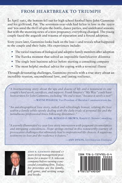 A secret heartbreak, a triumphant love story How can a young couple make it through the anguish of being separated by their parents and the trauma of a forced adoption? In April 1961, the bottom fell out for high school football hero John Gammino and his girlfriend, Pat. The seventeen-year-olds had fallen in love in the 1950s and '60s amid the thrill of spin-the-bottle, parking, weekend dance parties, and undefeated seasons. But with the stunning news of their teen pregnancy, everything changed. "Naked and refreshingly honest, openly dealing with the daily trials of personal life and the tumultuous professional times following divestiture." - Dr. Ronald O. Brown, Ronald O. Brown Consulting Fifty years later, Gammino looks back on the loss - and reveals what happened to the couple and their baby. You'll find out: ¿ The varied reactions of biological and adoptive family members after adoption ¿ The Eureka moment that solved an impossible family/career dilemma ¿ The single best piece of business advice to follow before starting a consulting company ¿ The most helpful medical advice for coping with a terminal illness Through devastating challenges, Gammino prevails with a true story about an incredible reunion that will inspire you to face life with unconditional love and lasting resilience. "A heartwarming story about the ups and downs of life and a testament to one couple's hard work, sacrifices, and support." - Wayne Pesaresi, former President of Sheridan Printing Co. Inc, current Vice President of Sheridan Communications Inc. "With poignant circumstances and intriguing coincidences, hope springs eternal in this noteworthy journey of provocative challenges that ultimately lead to inspirational life-choices." - Amy Dyson, Art Historian-Etiologist