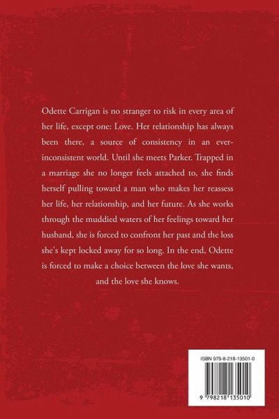 Odette Carrigan is no stranger to risk in every area of her life, except one: Love. Her relationship has always been there, a source of consistency in an ever-inconsistent world. Until she meets Parker. Trapped in a marriage she no longer feels attached to, she finds herself pulling toward a man who makes her reassess her life, her relationship, and her future. As she works through the muddied waters of her feelings toward her husband, she is forced to confront her past and the loss she's kept locked away for so long. In the end, Odette is forced to make a choice between the love she wants, and the love she knows.