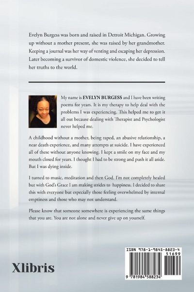 Evelyn Burgess was born and raised in Detroit Michigan. Growing up without a mother present, she was raised by her grandmother. Keeping a journal was her way of venting and escaping her depression. Later becoming a survivor of domestic violence, she decided to tell her truths to the world.