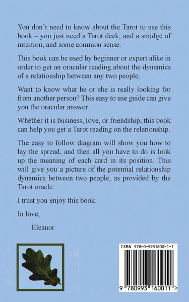 You don't need to know about the Tarot to use this book - you just need a Tarot deck, and a smidge of intuition, and some common sense. This book can be used by beginner or expert alike in order to get an oracular reading about the dynamics of a relationship between any two people. Want to know what he or she is really looking for from another person? This easy to use guide can give you the oracular answer. Whether it is business, love, or friendship, this book can help you get a Tarot reading on the relationship. The easy to follow diagram will show you how to lay the spread, and then all you have to do is look up the meaning of each card in its position. This will give you a picture of the potential relationship dynamics between two people, as provided by the Tarot oracle. I trust you enjoy this book. In love, Eleanor