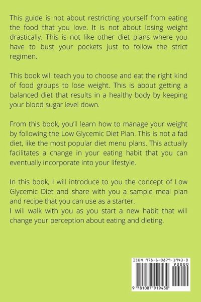 Are you tired of following fad diets which only does nothing but restrict your food intake? Are you on the look for an effective diet plan that can serve you for a lifetime? If yes, then a Low Glycemic Diet might hold the key for your long-awaited glow-up! In this guide, you will discover:How a no-diet diet can actually make you lose weight Why a "sweet" dieting success doesn't always involve sugar How to keep yourself full without drowning yourself in carbs Keeping a healthy weight without beating yourself (and your taste buds) up One trick that can make you forget that you're even dieting, and still get great results (hint: it's not supplement) This guide is not about restricting yourself from eating the food that you love. It is not about losing weight drastically. This is not like other diet plans where you have to bust your pockets just to follow the strict regimen. This guide will teach you to choose and eat the right kind of food groups to lose weight. This is about getting a balanced diet that results in a healthy body by keeping your blood sugar level down. From this guide, you'll learn how to manage your weight by following the Low Glycemic Diet Plan. This is not a fad diet, like the most popular diet menu plans. This actually facilitates a change in your eating habit that you can eventually incorporate into your lifestyle. In this guide, you will be introduced to you the concept of the Low Glycemic Diet. You will obtain a sample meal plan and recipe that you can use as a starter. I will walk with you as you start a new habit that will change your perception about eating and dieting. Table of contentsIntroduction Chapter 1 Carbohydrates and the Glycemic Index Chapter 2 Week 1: Getting Started Chapter 3 Week 2: Creating Your Meal Plan Chapter 4 Week 3: Evaluation and Adjustments Chapter 5 The Last Step: Make it a Habit Conclusion