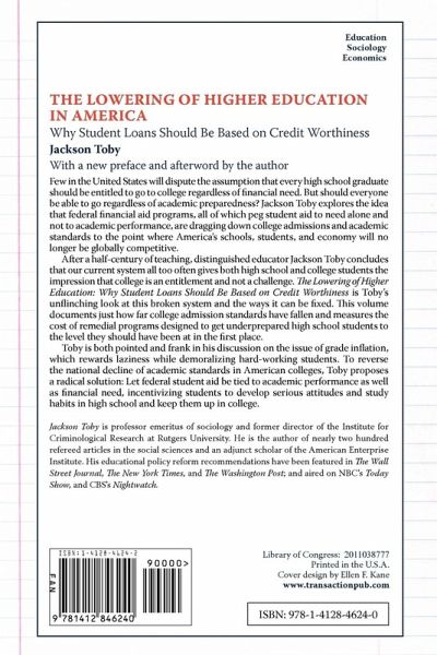 Few in the United States will dispute the assumption that every high school graduate should be entitled to go to college regardless of financial need. But should everyone be able to go regardless of academic preparedness? Jackson Toby explores the idea that federal financial aid programs, all of which peg student aid to need alone and not to academic performance, are dragging down college admissions and academic standards to the point where America's schools, students, and economy will no longer be globally competitive.After a half-century of teaching, distinguished educator Jackson Toby concludes that our current system all too often gives both high school and college students the impression that college is an entitlement and not a challenge. The Lowering of Higher Education: Why Student Loans Should Be Based on Credit Worthiness is Toby's unflinching look at this broken system and the ways it can be fixed. This volume documents just how far college admission standards have fallen and measures the cost of remedial programs designed to get underprepared high school students to the level they should have been at in the first place.Toby is both pointed and frank in his discussion on the issue of grade inflation, which rewards laziness while demoralizing hard-working students. To reverse the national decline of academic standards in American colleges, Toby proposes a radical solution: Let federal student aid be tied to academic performance as well as financial need, incentivizing students to develop serious attitudes and study habits in high school and keep them up in college.