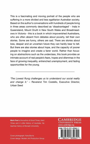 This 2003 book is a fascinating and moving portrait of the people who are suffering in a more divided and less egalitarian Australian society. Based on the author's conversations with hundreds of people living in three areas commonly described as 'disadvantaged' - Inala in Queensland, Mount Druitt in New South Wales and Broadmeadows in Victoria - this is a book in which impoverished Australians, who are often absent from debates about poverty, tell their own stories. Some are funny, others are sad. There are stories about loss, despair and an uncertain future they can hardly bear to tell. But there are also stories about hope, and the capacity of poorer people to imagine and create a fairer world. Rather than focusing on abstractions such as the underclass, this book provides an intimate account of real people's fears, hopes and dilemmas in the face of growing inequality, entrenched unemployment, and fading opportunities for the young.