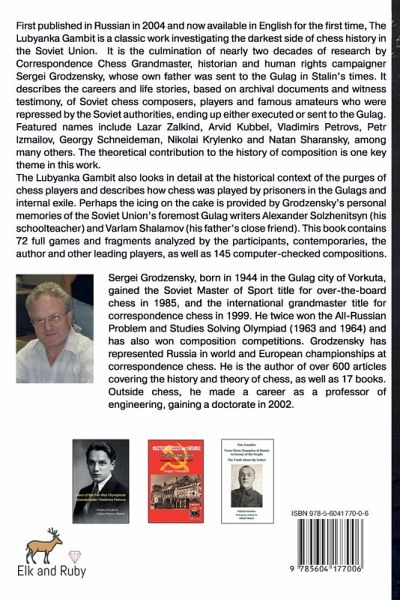 First published in Russian in 2004 and now available in English for the first time, The Lubyanka Gambit is a classic work investigating the darkest side of chess history in the Soviet Union. It is the culmination of nearly two decades of research by Correspondence Chess Grandmaster, historian and human rights campaigner Sergei Grodzensky, whose own father was sent to the Gulag in Stalin's times. It describes the careers and life stories, based on archival documents and witness testimony, of Soviet chess composers, players and famous amateurs who were repressed by the Soviet authorities, ending up either executed or sent to the Gulag. Featured names include Lazar Zalkind, Arvid Kubbel, Vladimirs Petrovs, Petr Izmailov, Georgy Schneideman, Nikolai Krylenko and Natan Sharansky, among many others. The theoretical contribution to the history of composition is one key theme in this work. The Lubyanka Gambit also looks in detail at the historical context of the purges of chess players and describes how chess was played by prisoners in the Gulags and internal exile. Perhaps the icing on the cake is provided by Grodzensky's personal memories of the Soviet Union's foremost Gulag writers Alexander Solzhenitsyn (his schoolteacher) and Varlam Shalamov (his father's close friend). This book contains 72 full games and fragments analyzed by the participants, contemporaries, the author and other leading players, as well as 145 computer-checked compositions. Check out the publisher's website for special deals on this and other books!