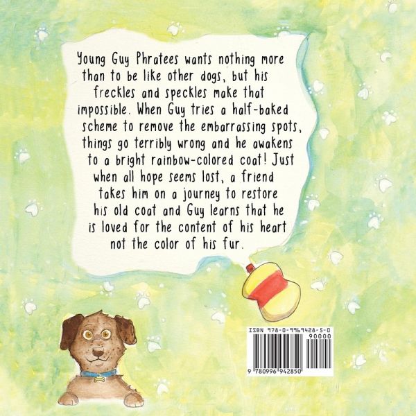 Young Guy Phratees wants nothing more than to be like other dogs, but his freckles and speckles make that impossible. When Guy tries a half-baked scheme to remove the embarrassing spots, things go terribly wrong and he awakens to a bright rainbow-colored coat! Just when all hope seems lost, a friend takes him on a journey to restore his old coat and Guy learns that he is loved for the content of his heart not the color of his fur. This fun coloring book takes you to a fanciful dog world and teaches important lessons on peer pressure, self-acceptance, and friendship.