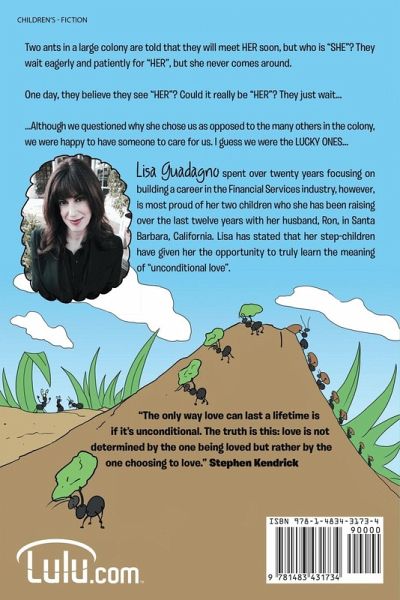 Two ants in a large colony are told that they will meet HER soon, but who is "SHE"? They wait eagerly and patiently for "HER", but she never comes around. One day, they believe they see "HER"? Could it really be "HER"? They just wait... ...Although we questioned why she chose us as opposed to the many others in the colony, we were happy to have someone to care for us. I guess we were the LUCKY ONES... "The only way love can last a lifetime is if it's unconditional. The truth is this: love is not determined by the one being loved but rather by the one choosing to love." Stephen Kendrick