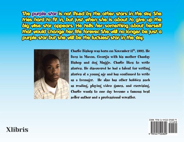 The purple star is not liked by the other stars in the sky. She tries hard to fit in, but just when she is about to give up the big wise star appears. He tells her something about herself that would change her life forever. She will no longer be just a purple star but she will be the luckiest star in the sky.