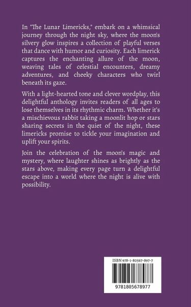 In "The Lunar Limericks," embark on a whimsical journey through the night sky, where the moon's silvery glow inspires a collection of playful verses that dance with humor and curiosity. Each limerick captures the enchanting allure of the moon, weaving tales of celestial encounters, dreamy adventures, and cheeky characters who twirl beneath its gaze. With a light-hearted tone and clever wordplay, this delightful anthology invites readers of all ages to lose themselves in its rhythmic charm. Whether it's a mischievous rabbit taking a moonlit hop or stars sharing secrets in the quiet of the night, these limericks promise to tickle your imagination and uplift your spirits. Join the celebration of the moon's magic and mystery, where laughter shines as brightly as the stars above, making every page turn a delightful escape into a world where the night is alive with possibility.