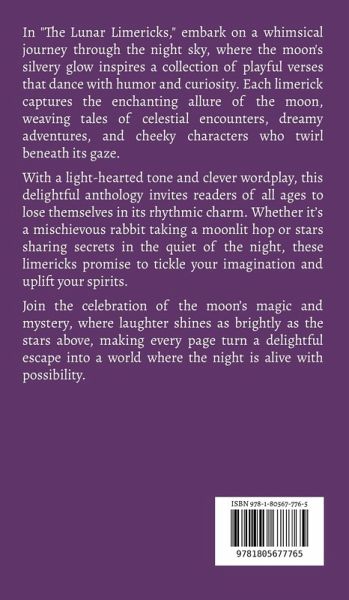 In "The Lunar Limericks," embark on a whimsical journey through the night sky, where the moon's silvery glow inspires a collection of playful verses that dance with humor and curiosity. Each limerick captures the enchanting allure of the moon, weaving tales of celestial encounters, dreamy adventures, and cheeky characters who twirl beneath its gaze. With a light-hearted tone and clever wordplay, this delightful anthology invites readers of all ages to lose themselves in its rhythmic charm. Whether it's a mischievous rabbit taking a moonlit hop or stars sharing secrets in the quiet of the night, these limericks promise to tickle your imagination and uplift your spirits. Join the celebration of the moon's magic and mystery, where laughter shines as brightly as the stars above, making every page turn a delightful escape into a world where the night is alive with possibility.