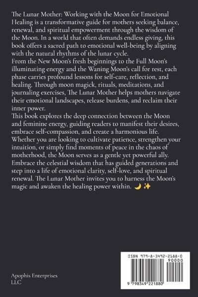 The Lunar Mother: Working with the Moon for Emotional Healing is a transformative guide for mothers seeking balance, renewal, and spiritual empowerment through the wisdom of the Moon. In a world that often demands endless giving, this book offers a sacred path to emotional well-being by aligning with the natural rhythms of the lunar cycle. From the New Moon's fresh beginnings to the Full Moon's illuminating energy and the Waning Moon's call for rest, each phase carries profound lessons for self-care, reflection, and healing. Through moon magick, rituals, meditations, and journaling exercises, The Lunar Mother helps mothers navigate their emotional landscapes, release burdens, and reclaim their inner power. This book explores the deep connection between the Moon and feminine energy, guiding readers to manifest their desires, embrace self-compassion, and create a harmonious life. Whether you are looking to cultivate patience, strengthen your intuition, or simply find moments of peace in the chaos of motherhood, the Moon serves as a gentle yet powerful ally. Embrace the celestial wisdom that has guided generations and step into a life of emotional clarity, self-love, and spiritual renewal. The Lunar Mother invites you to harness the Moon's magic and awaken the healing power within. ¿¿¿¿¿