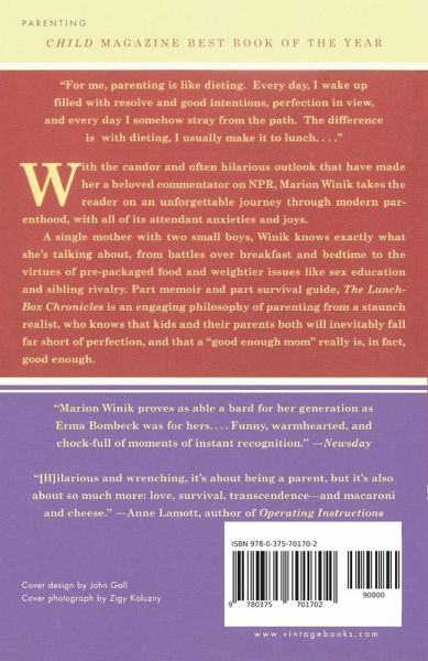 Child Magazine Best Book of the Year "For me, parenting is like dieting. Every day, I wake up filled with resolve and good intentions, perfection in view, and every day I somehow stray from the path. The difference is with dieting, I usually make it to lunch. . . ." With the candor and often hilarious outlook that have made her a beloved commentator on NPR, Marion Winik takes the reader on an unforgettable journey through modern parenthood, with all of its attendant anxieties and joys. A single mother with two small boys, Winik knows exactly what she's talking about, from battles over breakfast and bedtime to the virtues of pre-packaged food and weightier issues like sex education and sibling rivalry. Part memoir and part survival guide, The Lunch-Box Chronicles is an engaging philosophy of parenting from a staunch realist, who knows that kids and their parents both will inevitably fall far short of perfection, and that a "good enough mom" really is, in fact, good enough.