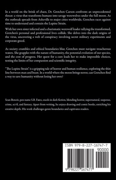 In a world where the line between human and beast blurs, Dr. Gretchen Carson faces her greatest challenge yet. When a mysterious virus turns people into savage werewolves during the full moon, civilization teeters on the brink of collapse. As cities fall and chaos reigns, Gretchen races against time to find a cure. But with her own sister infected and a charismatic werewolf leader preaching supremacy, the stakes couldn't be higher. Gretchen's journey takes her from quarantined cities to secret laboratories, forcing her to confront the darkness within herself and question what it truly means to be human. As the virus mutates and spreads globally, she must make impossible choices that will shape the future of our species. With pulse-pounding action and deep moral dilemmas, "The Lupine Strain" explores the thin line between humanity and savagery. S.B. Fates delivers a gripping tale that will keep you on the edge of your seat, perfect for fans of Justin Cronin's "The Passage" and Max Brooks' "World War Z". In a world where the moon brings terror, can Gretchen save humanity without losing her own? Unleash the beast within. Get your copy of "The Lupine Strain" now and experience the dark transformation of humanity.